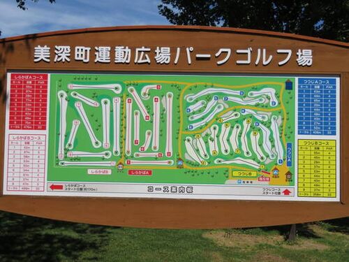 ●細長く距離のあるホールが中心北海道上川管内音威子府(おといねっぷ)村。18H。野球場の周囲にあるコースとなる。2018/7/29調査(写真撮影のみ)↑看板。23mから95mまで、ホールの長さは様々。Aのほうが長く、510mもある。↑野球場周辺の狭く細長いコースで…