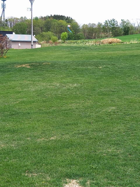 下って左傾斜もあるパー4。引っ張って左のネットに突っ込まないように。