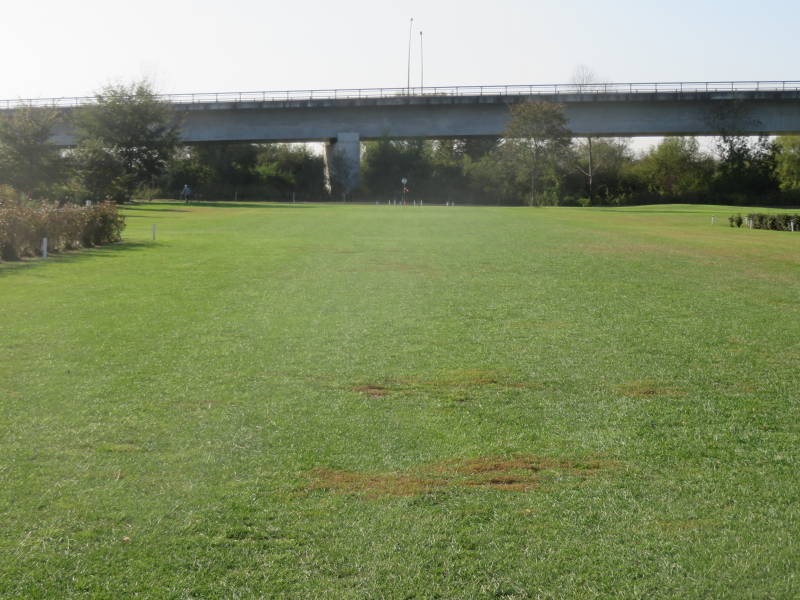 やや右に曲がる。コースはだだっ広いが、最短ルートでは右側にある植栽OBに注意。